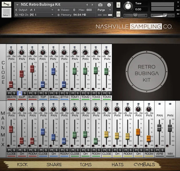 All mixing tools included in Kontakt 5 patches, easily accessible in our detailed interface. Hardware reverb impulse responses, transient tools, compressors, SSL EQs, tape saturation, drum tuning, and output routing.